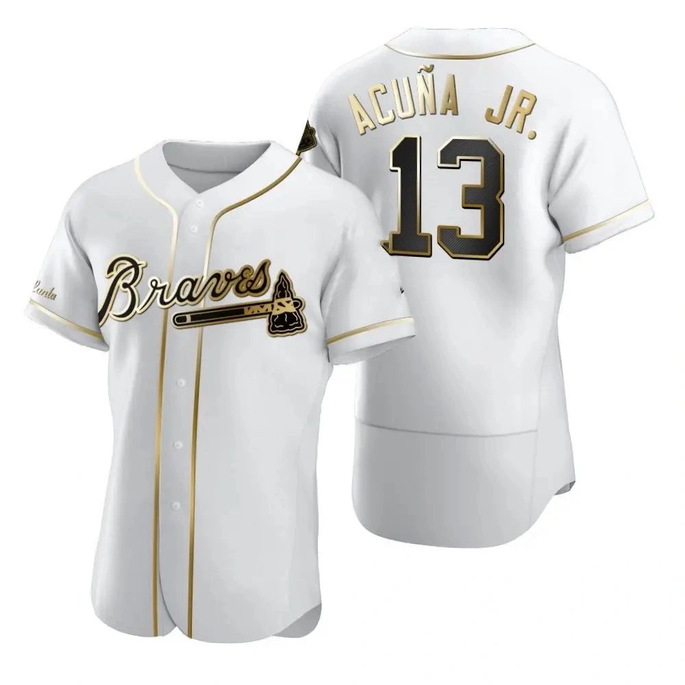 Elevate your Braves fandom with our exclusive Acuna Jersey. This stylish white jersey adorned with gold letters and numbers is the ultimate statement of team pride. Join us in celebrating the game and show your unwavering support for Atlanta Braves. Shop now, and be part of the winning spirit! We're excited to have you as our customer and look forward to serving you again in the future. Thank you, and may your passion for sports always shine bright!